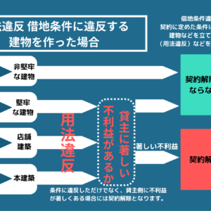 トラブルシリーズ 用法違反について 2025年7月4日 ニュース/コラム 借地条件違反とは契約に定めている借地条件に違反する建物などを建てた場合を用法違反といいまず。 ここでは具体的な事例に基づいて用法違反について解説していきます。 建物を堅牢な建物にした 契… 続きを読む